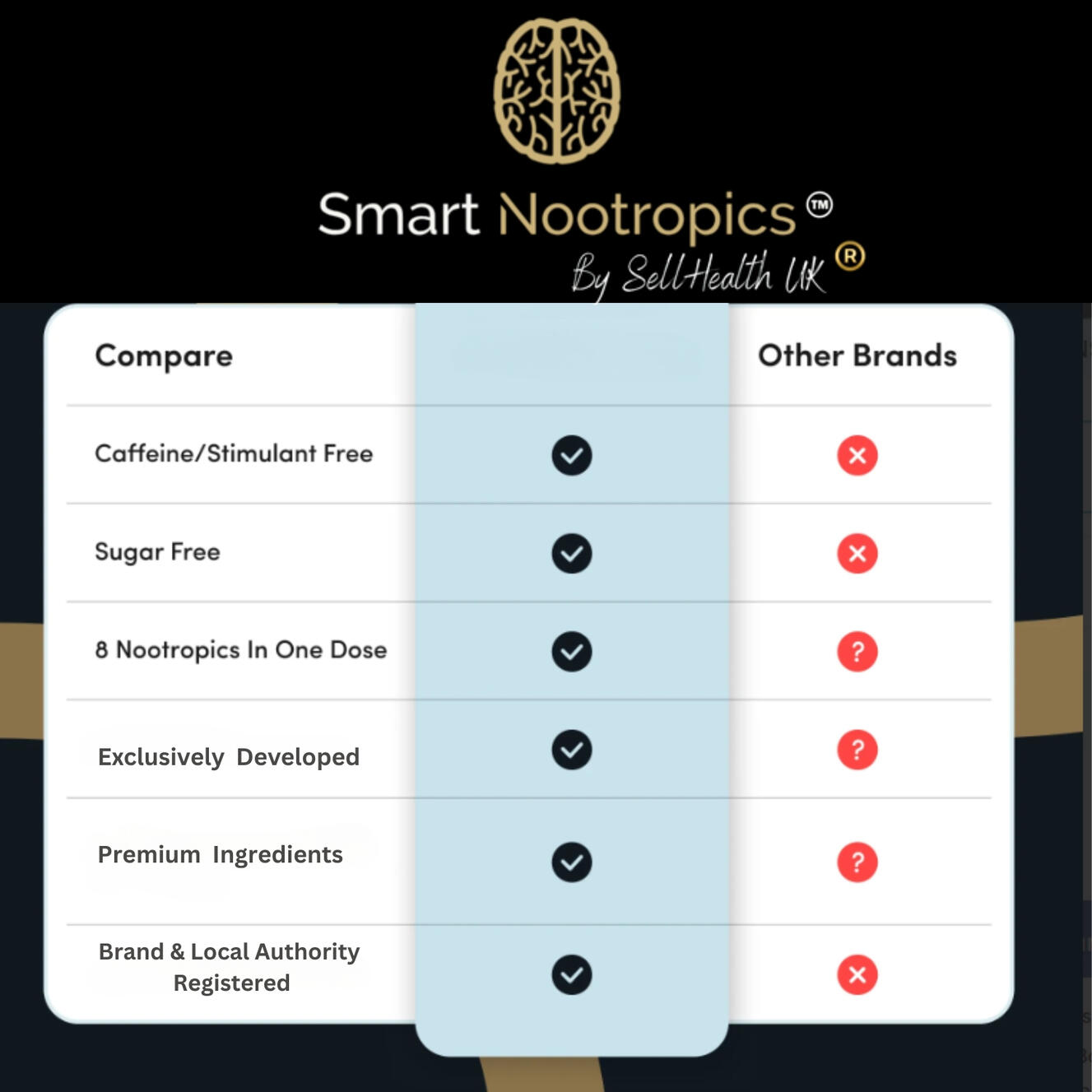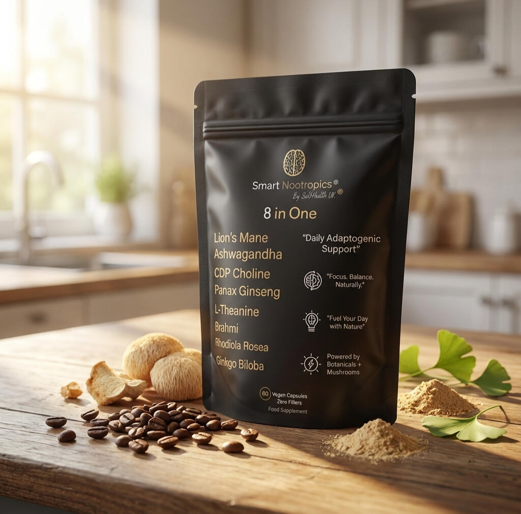 Smart Nootropics® 8-in-1 is a precision-formulated cognitive enhancement complex created for those who demand mental clarity, sustained focus, and stress-resistant performance. Developed by the research team at SellHealth UK®, this formula goes beyond generic nootropic blends by using synergistic ingredient pairings to elevate cognitive function across multiple pathways.This is not a stimulant-driven quick fix. It is a balanced, intelligently designed daily formula that supports memory, mood, focus, and adaptive performance — without jitters, crashes, or overstimulation.